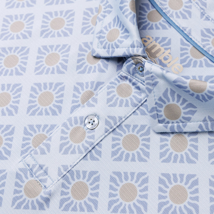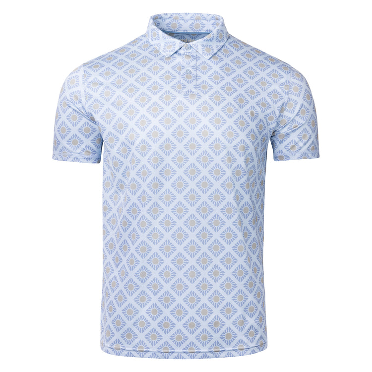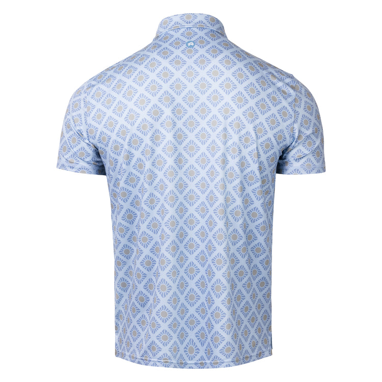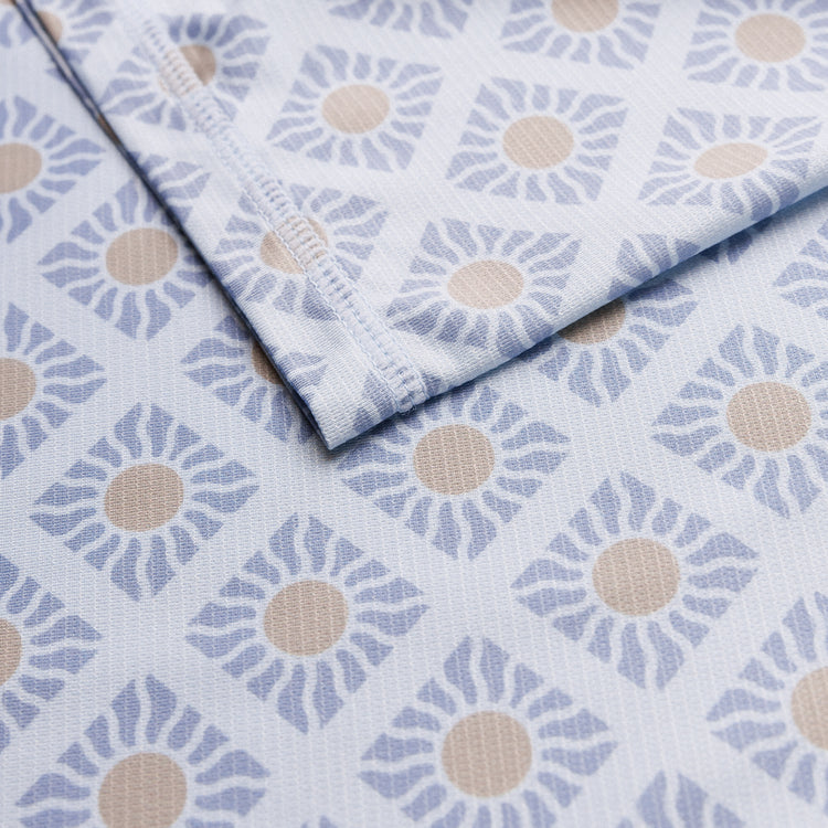 A polo built for the brighter days ahead. The Sunny Days print is all about crisp mornings and warm afternoons, with a repeating square pattern and subtle sun rays woven in. Lightweight, breathable, and made for movement—whether you're chasing birdies or just soaking up the season. Blue shadow color