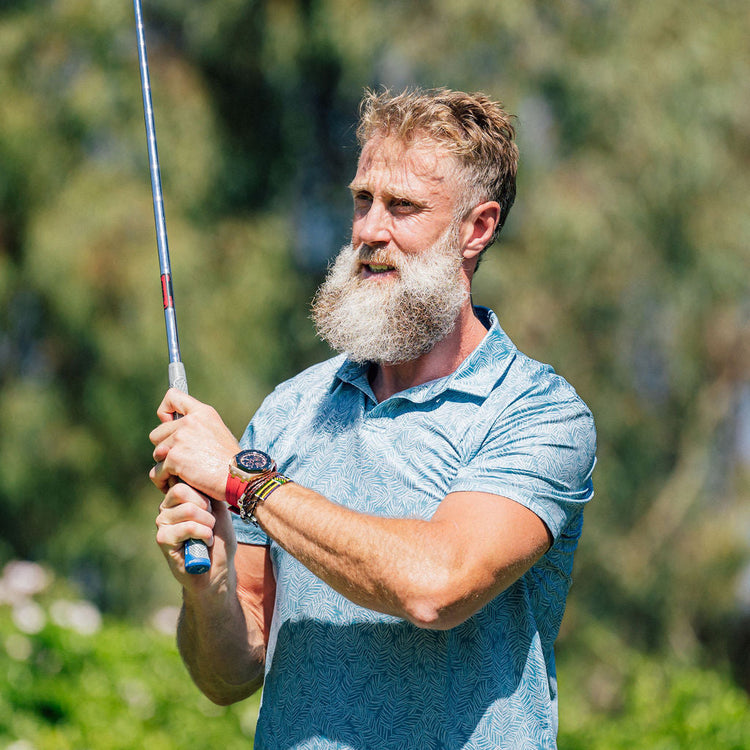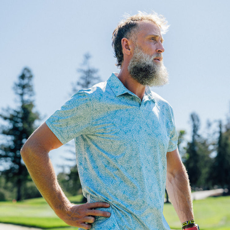 The Viewpoint Polo is built from our signature stretch-recycled fabric — soft, breathable, and ready for any round. The Pines print gives it that subtle movement of branches in the breeze — clean enough for the course, relaxed enough for everything after.