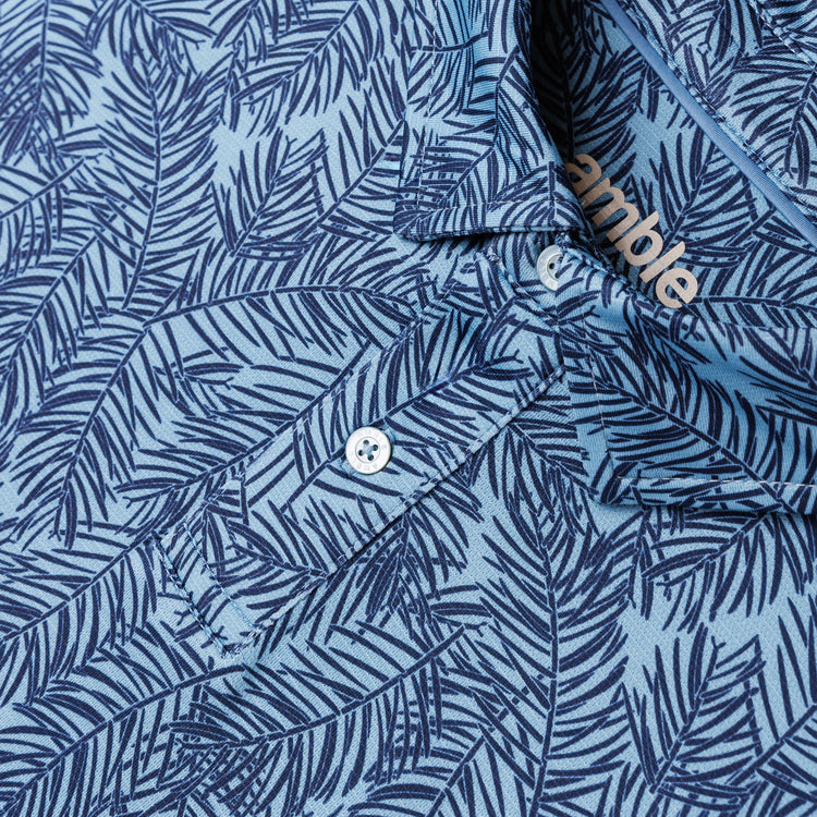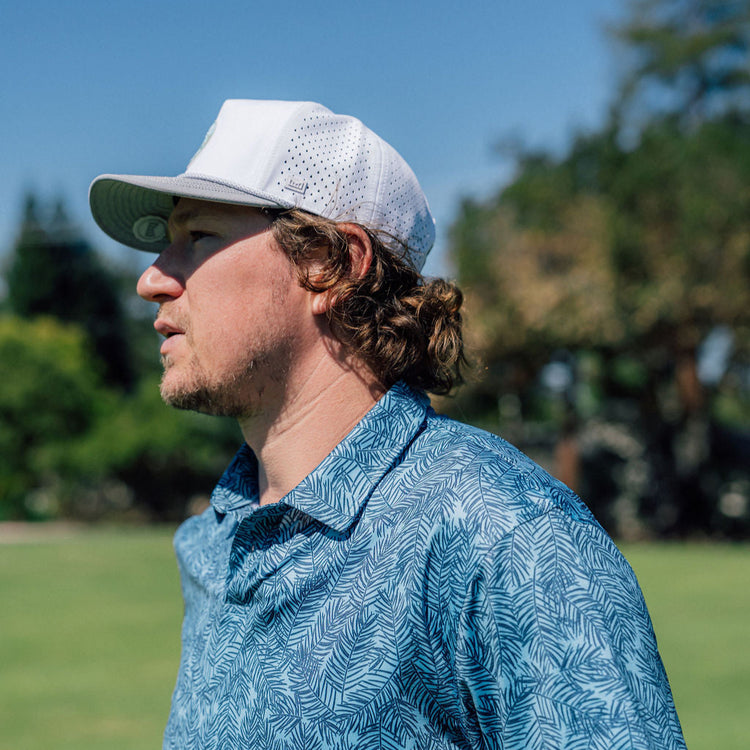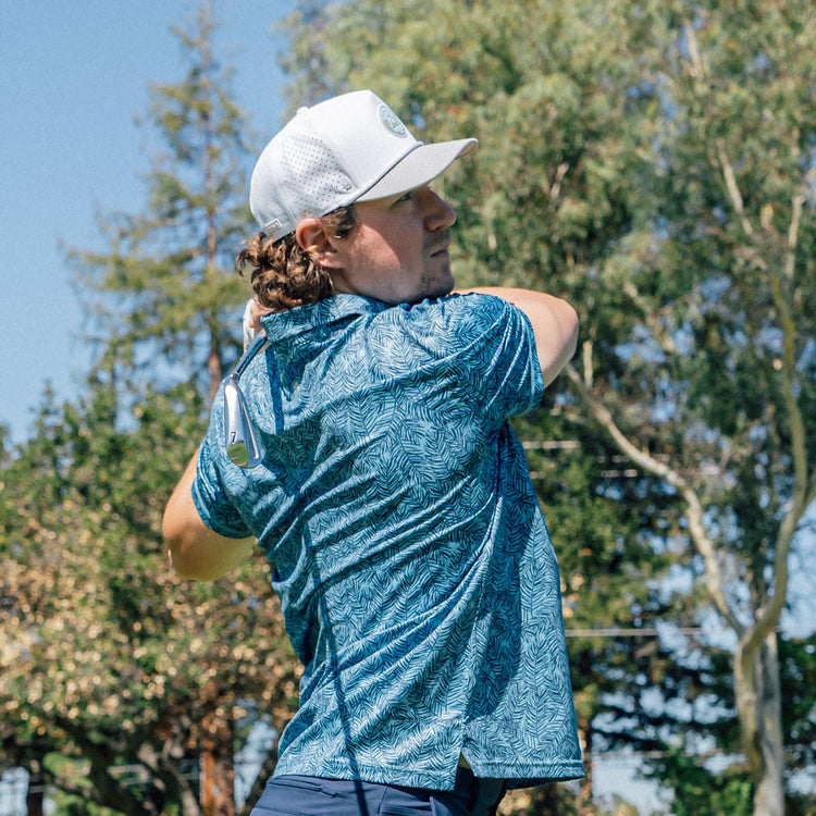 The Viewpoint Polo is built from our signature stretch-recycled fabric — soft, breathable, and ready for any round. The Pines print gives it that subtle movement of branches in the breeze — clean enough for the course, relaxed enough for everything after.